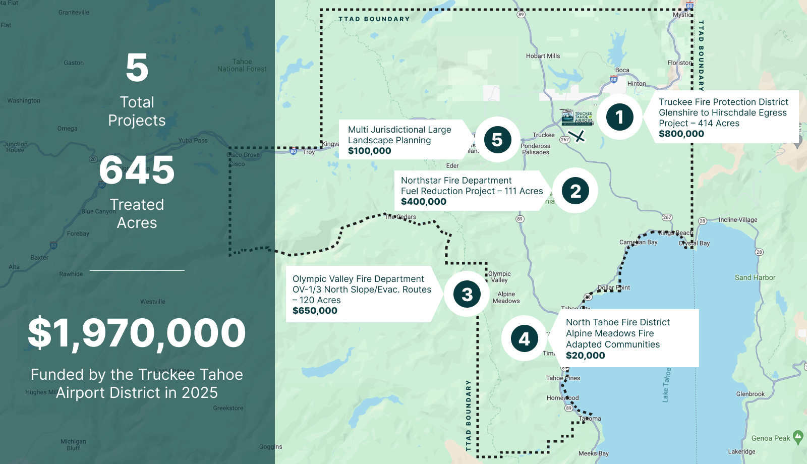 The TTAD board believes that they can continue to focus on funding additional fire mitigation projects in the region into the foreseeable future to serve the greater good of providing fire break buffers and thinning of overgrown forests thereby better protecting everyone who resides within the TTAD boundaries. The following map shows Project Locations and Project Details.
