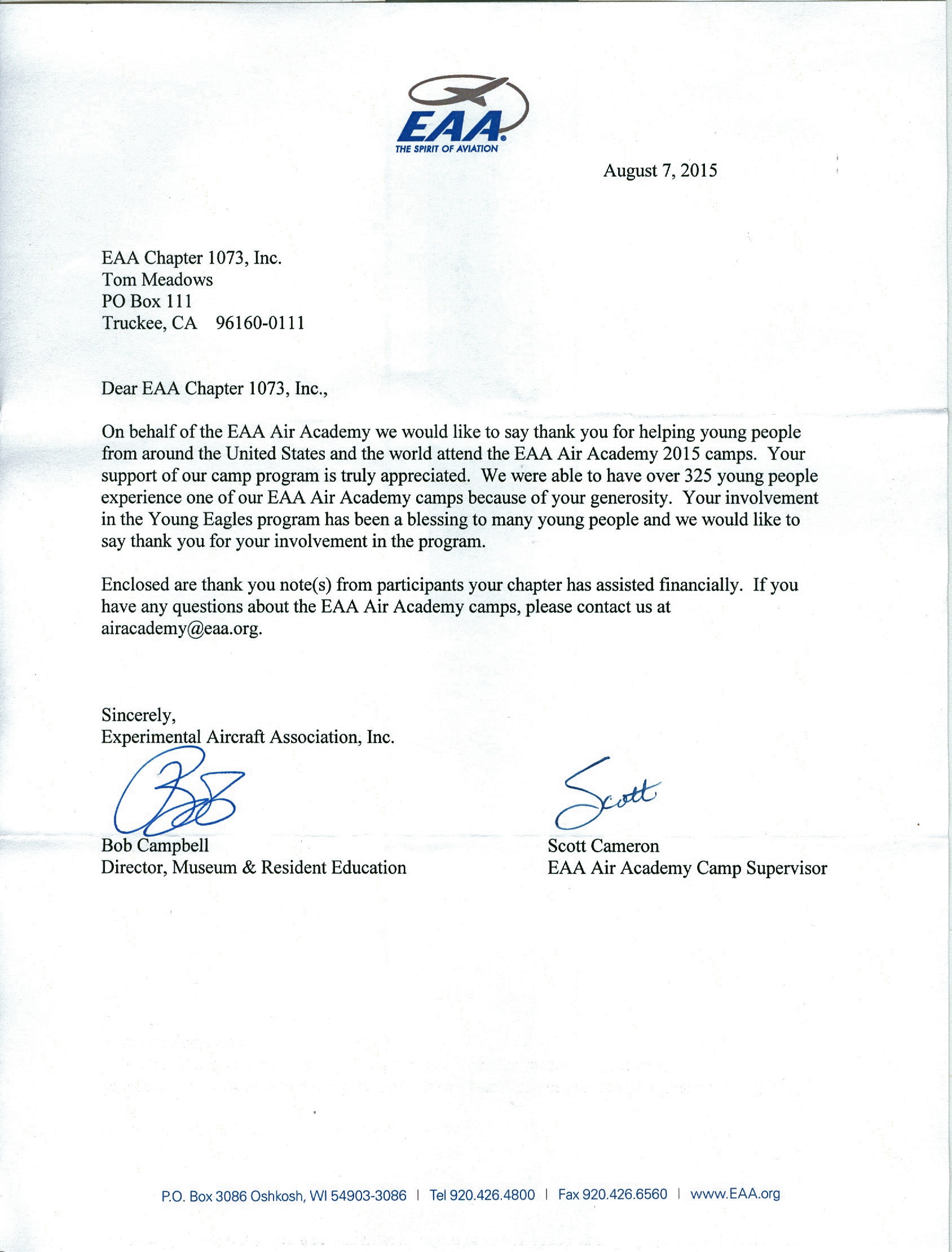 EAA 1073 is planning to award three scholarships in 2016. Application information may be obtained by contacting: yecoord1073@outlook.com. Eligibility started with the Young Eagle flights after the very successful 2015 Truckee Tahoe Family Festival, and applications must be postmarked or emailed no later than February 28, 2016. Winners will be notified by March 31.